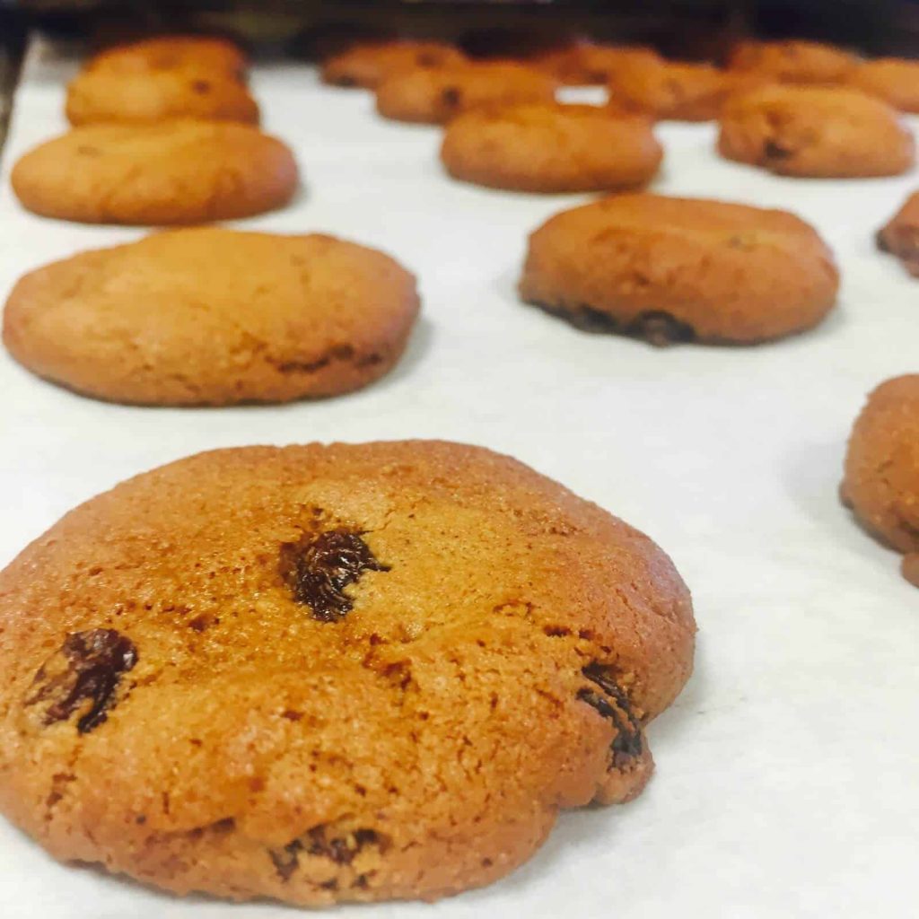 Ingredients: Almond Flour, arrowroot, eggs, organic coconut palm sugar, chocolate chips(organic unsweetened chocolate, organic coconut palm sugar, organic cocoa butter) vanilla extract, baking soda, & sea salt.